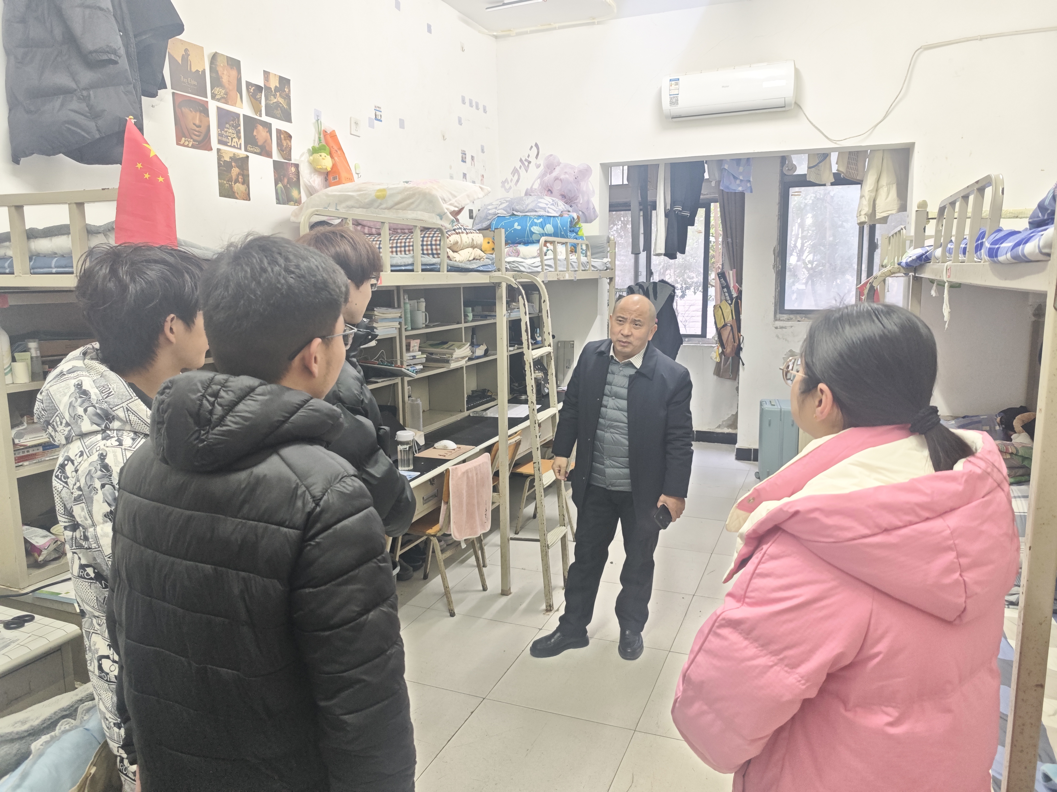 交流过程中,黄新细致询问了同学们的住宿条件、饮食情况及日常生活体验,特别关心食堂餐饮质量、外卖卫生安全以及室友相处状况。他叮嘱同学们注意消防安全,保持良好生活习惯,共同营造安全、文明、和谐的宿舍环境。