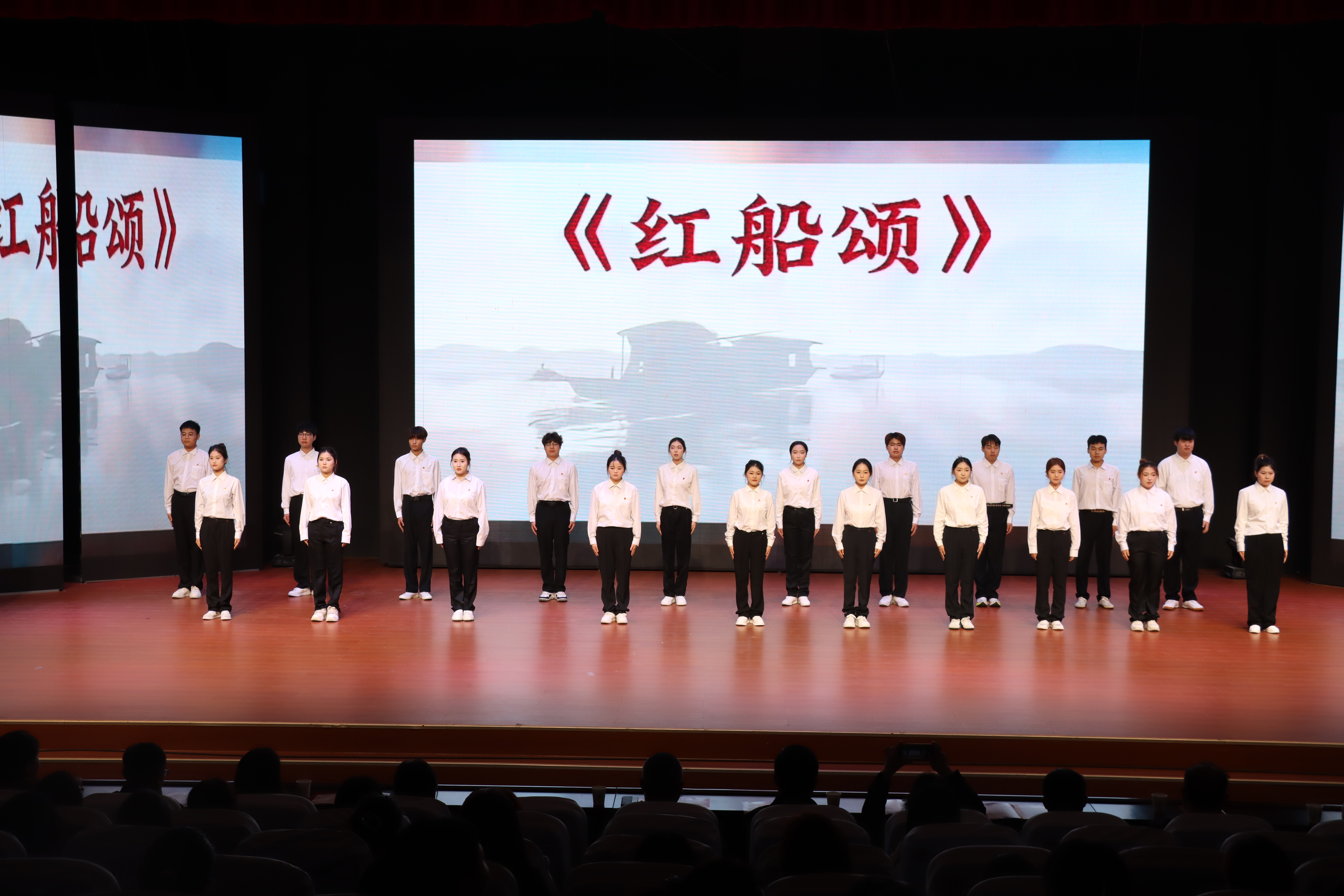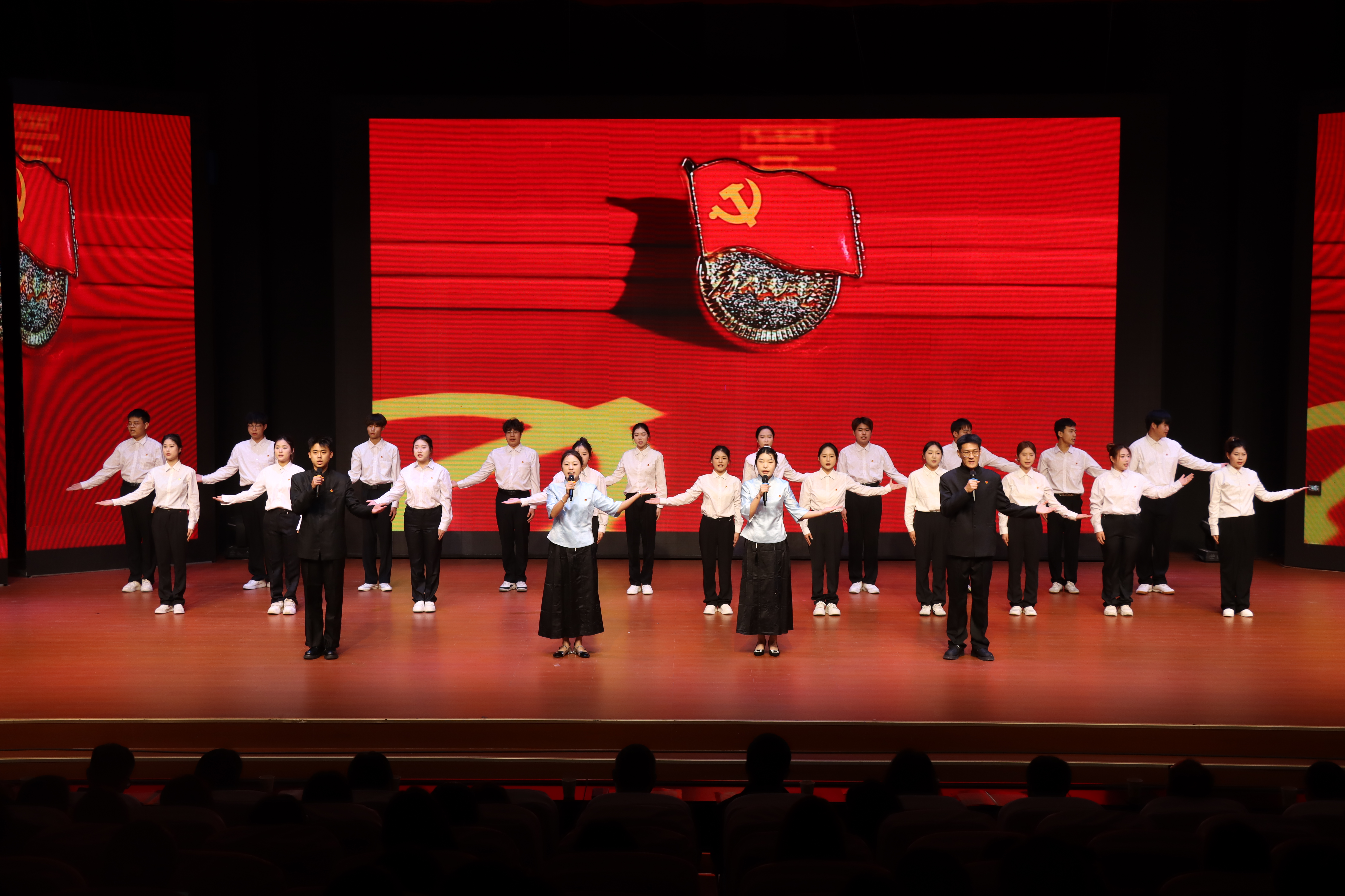 近日,在学校第三届“清风杯”红廉作品朗诵会的舞台上,买球官方网站的24名学子,以一场气势恢宏、情感真挚的《红船颂》朗诵表演,赢得了满堂喝彩。这不仅是一次精彩的艺术展示,更是学院推动“党建带团建”工作走深走实的生动实践。