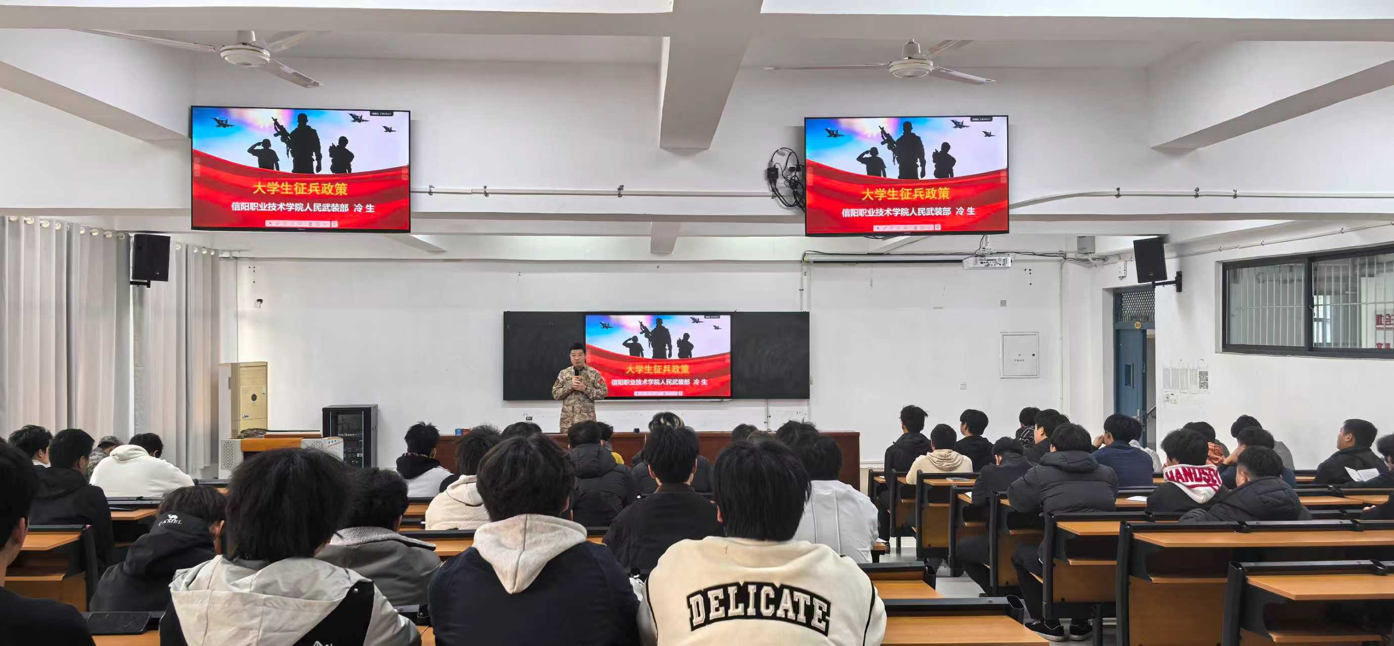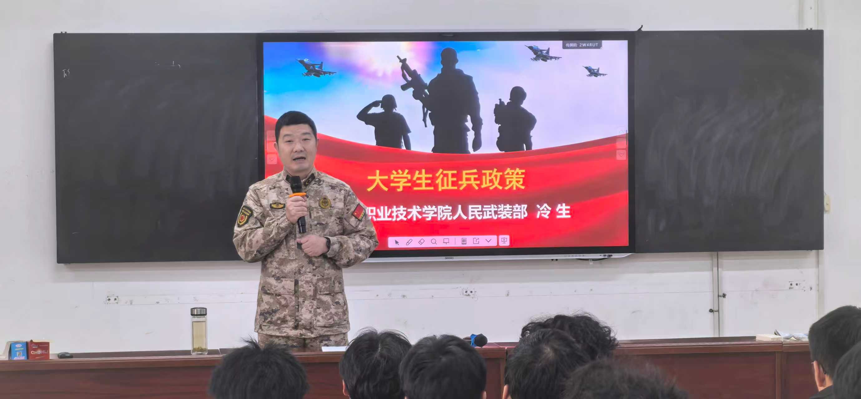 为深入贯彻落实新时代党的强军思想,强化党建引领作用,推动国防教育走深走实,11月11日,买球官方网站特邀学校武装部冷生老师为130余名有意参军的学生举办征兵政策宣讲会。