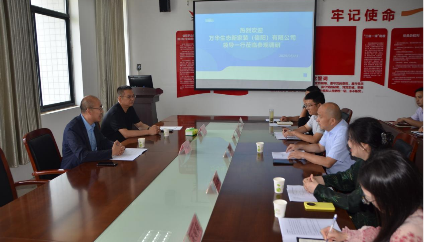 2025年5月23日,万华生态集团行政总监兼万华生态新家装集团行政总监徐向荣万华生态新家装集团产品总监班翊一行就深化校企合作事宜来我进行考察交流党委委员、工会主席黄新,教务处副处长张娅莉,学院党总支书记刘亚梅及相关行政人员参加座谈会