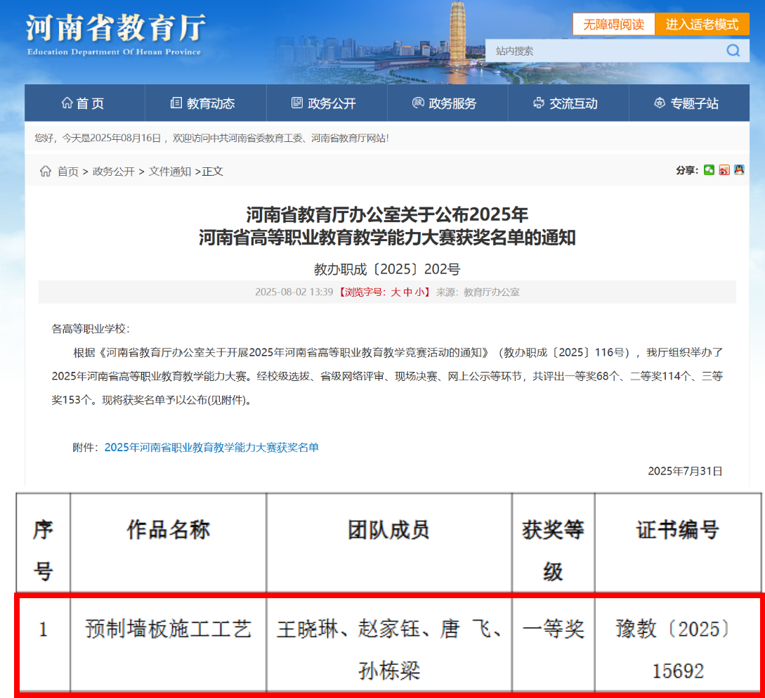 近日,河南省教育厅发布2025年河南省高等职业教育教学能力大赛获奖名单的通知,我院王晓琳、赵家钰、唐飞等4名老师组队参赛的作品《预制墙板施工工艺》获得理工农医类课程组一等奖的佳绩。