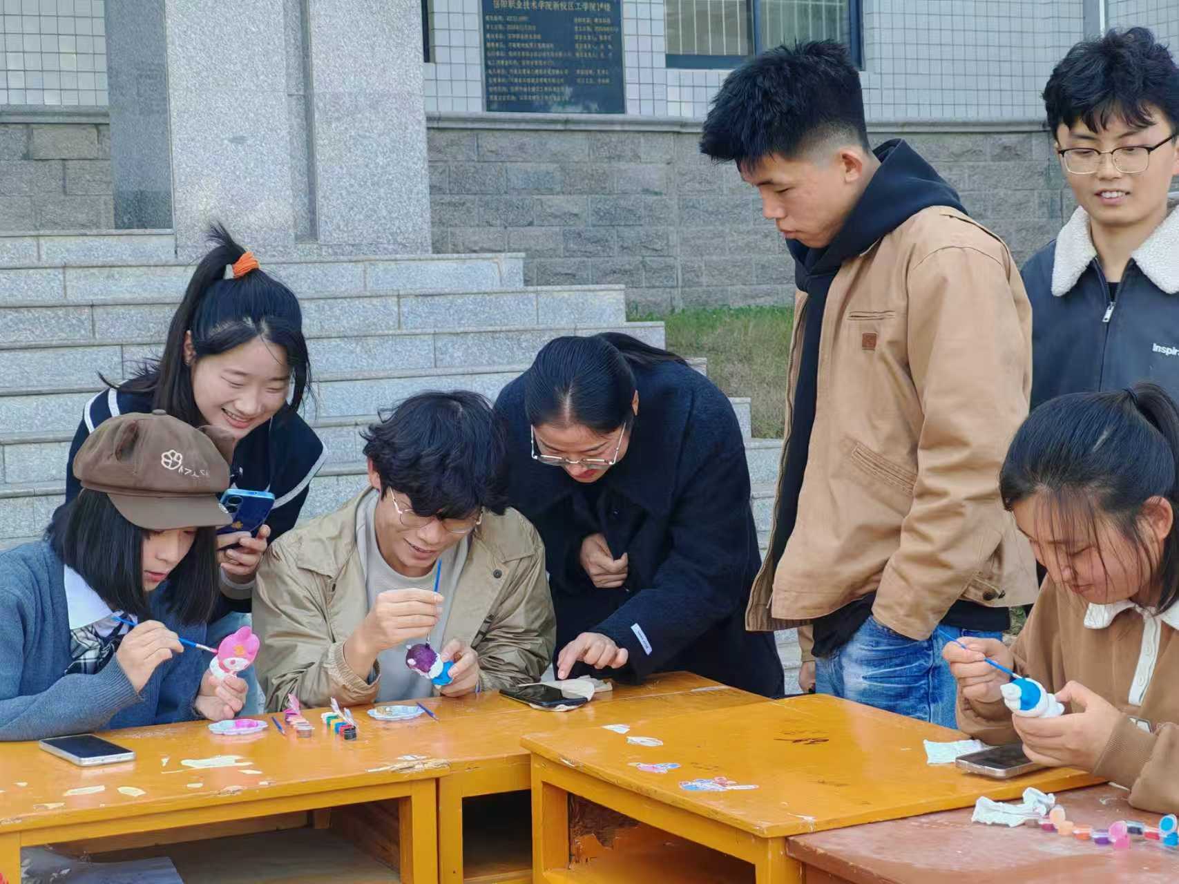 其间,各班级辅导员亲临现场,化身“暖心画友”穿梭其间。时而指点学生色彩搭配的小技巧,时而为学生独特的创意点赞,老师们诙谐幽默的言语,发自内心的赞赏,让现场欢笑不断。纯白的石膏在师生的互动中逐渐绽放光彩,原本安静的活动现场,也因这份双向的温暖变得格外鲜活。
