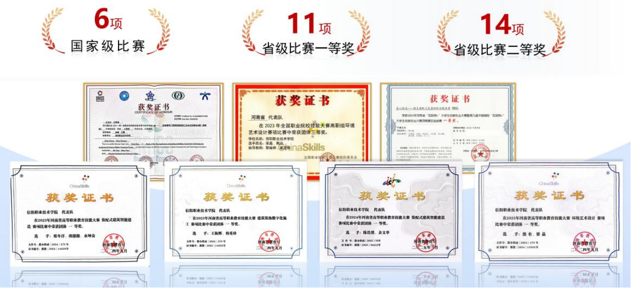学院始终坚持以立德树人为根本任务,贯彻“三全育人”理念,注重学生综合素质与专业技能的全面发展。学生在2025年世界职业院校技能大赛总决赛争夺赛艺术设计赛道中荣获铜奖,2023、2024年在省级高等职业教育技能大赛中荣获一等奖6项,并在全国职业院校“发明杯”大学生创新大赛、河南省职业技能大赛、河南省“互联网+”大学生创新创业大赛及“一带一路”暨金砖国家技能发展与技术创新大赛等重要赛事中屡获佳绩。